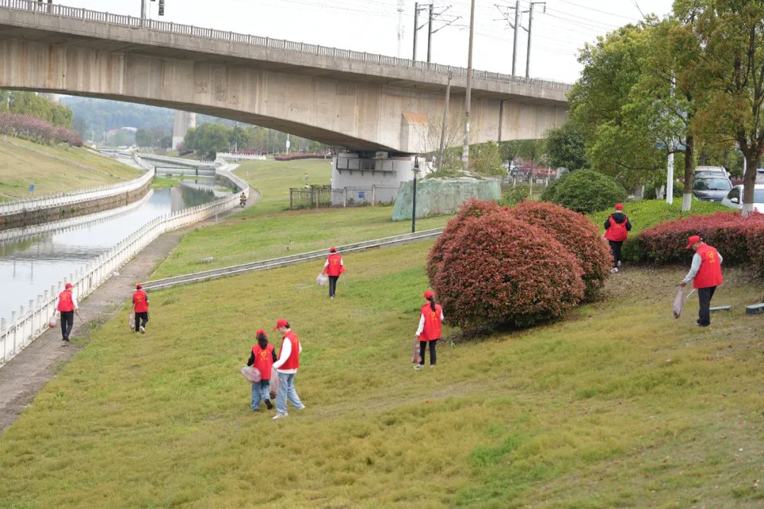 鶯初解語,最是一年春好處,室內活動結束后,大家來到圭塘河畔開展“文明實踐我行動 德潤雨花志愿紅”圭塘河環境整治大行動,以實際行動傳遞“奉獻、友愛、互助、進步”的志愿精神。活動開始前學習了《推動綠色發展,促進人與自然和諧共生》,宣讀了《黨員發揮先鋒模范作用助推圭塘河流域水環境綜合整治倡議書》,之后全體成員沿著圭塘河水域拾撿沿線生活垃圾。站在人與自然和諧共生的高度來謀劃經濟社會發展,向著美麗中國目標不斷邁進。