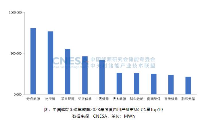 2023年,國內(nèi)用戶側(cè)市場中,儲能系統(tǒng)出貨量排名前十的中國企業(yè),依次為:奇點能源、比亞迪、采日能源、弘正儲能、中天儲能、沃太能源、科華數(shù)能、南瑞繼保、智光儲能和融和元儲。