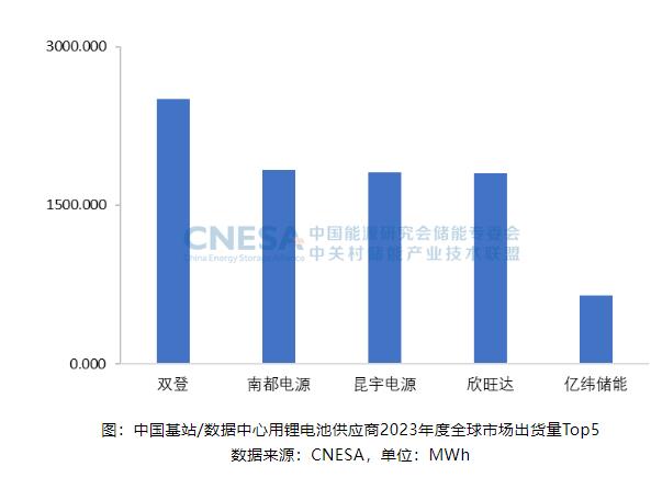 2023年,全球市場中,基站/數(shù)據(jù)中心用鋰電池出貨量排名前五位的中國企業(yè),依次為:雙登、南都電源、昆宇電源、欣旺達(dá)和億緯儲能。